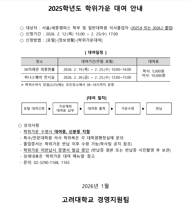 | 제목 | 2025학년도 학위복 대여 안내 |